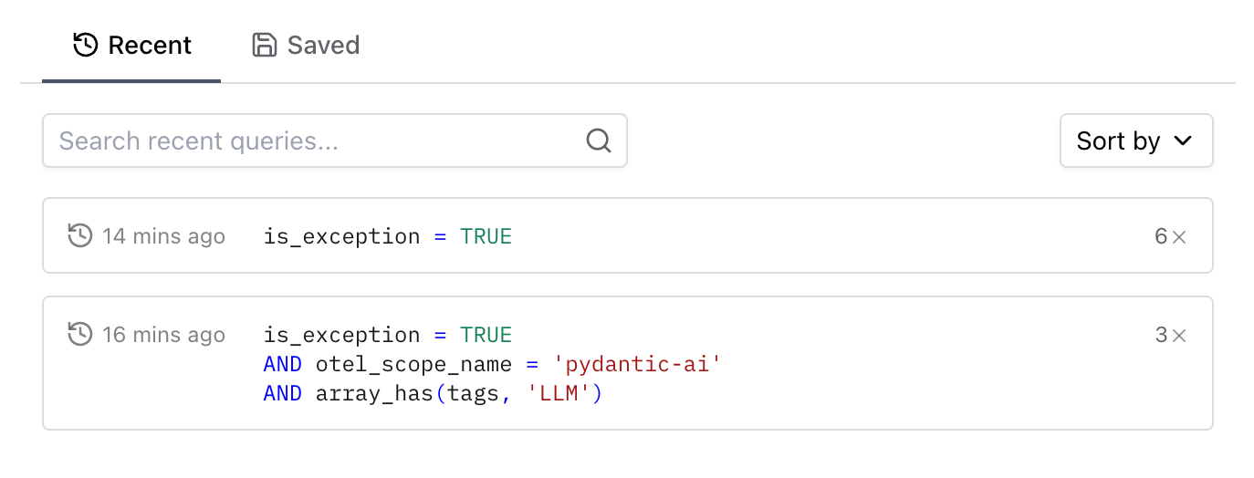 - Use the search fields in both Recent and Saved tabs to quickly find queries by name.